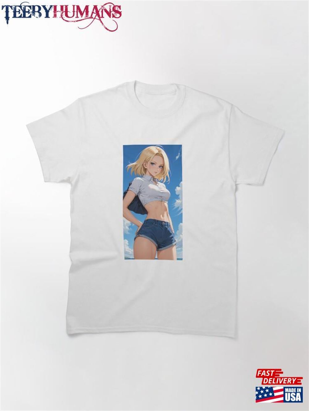 Android 18 Classic T-Shirt Unisex Sweatshirt A music t-shirt is a type of clothing that is designed to showcase one’s love and passion for music. It typically features various elements related to music, such as musical instruments, lyrics, album covers, or iconic images of famous musicians or bands. These t-shirts serve as a form of self-expression and allow individuals to display their musical taste and preferences to the world. Music t-shirts come in a wide range of styles, colors, and designs, catering to different genres and eras of music. They can be found in various sizes, from small to extra-large, ensuring that everyone can find a t-shirt that fits them comfortably. Some music t-shirts may also incorporate additional elements like tour dates, concert venues, or band logos, making them even more unique and collectible for fans. Wearing a music t-shirt not only shows one’s admiration for a particular artist or band but also serves as a conversation starter among fellow music enthusiasts. It can spark discussions about favorite songs, albums, or memorable concert experiences, creating a sense of camaraderie and shared passion for music. Music t-shirts are not only popular among fans but also embraced by musicians themselves. Many artists and bands create their own merchandise, including t-shirts, as a way to promote their music and connect with their audience. These t-shirts often become sought-after items for fans, representing a special connection to their favorite artists. In addition to being a fashion statement, music t-shirts can also be seen as a form of nostalgia. They can evoke memories of past concerts, music festivals, or significant moments in one’s life that were accompanied by a particular song or artist. By wearing a music t-shirt, individuals can relive those cherished memories and keep the spirit of music alive. Overall, a music t-shirt is more than just a piece of clothing. It is a symbol of one’s love for music, a means of self-expression, and a way to connect with others who share the same passion. Whether worn casually or at music events, these t-shirts serve as a reminder of the power and influence that music has on our lives.