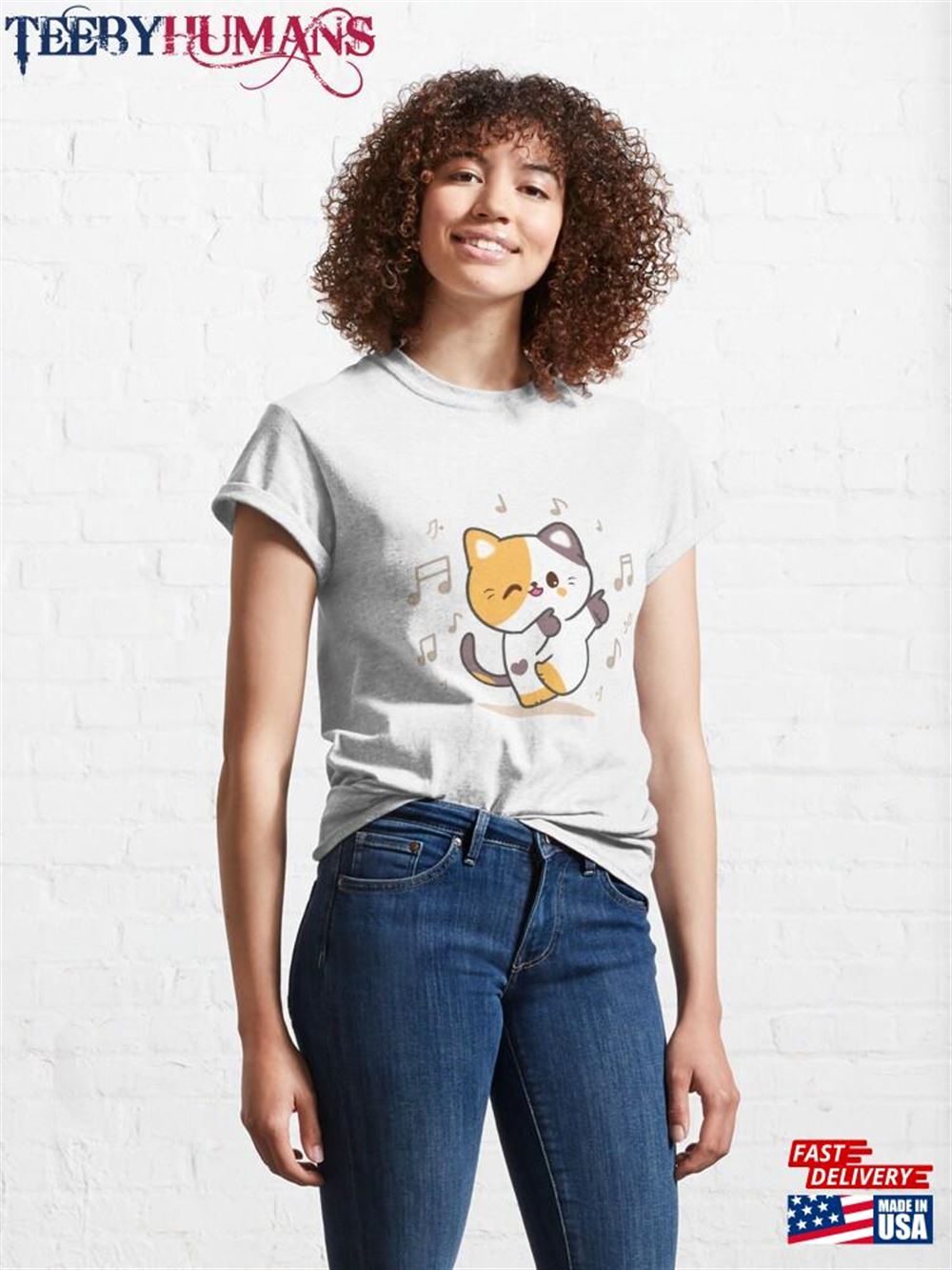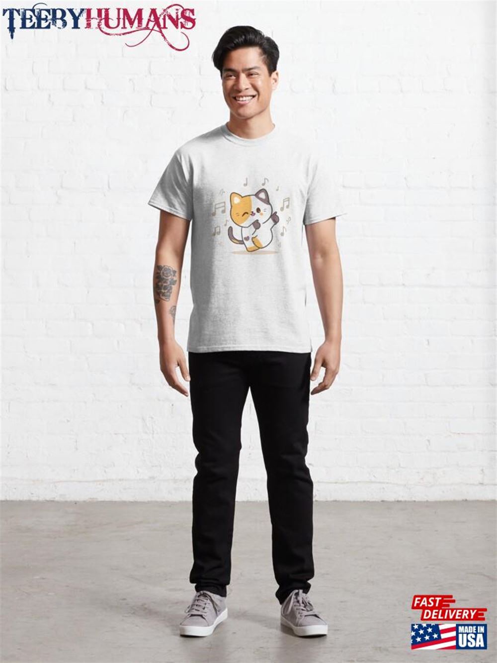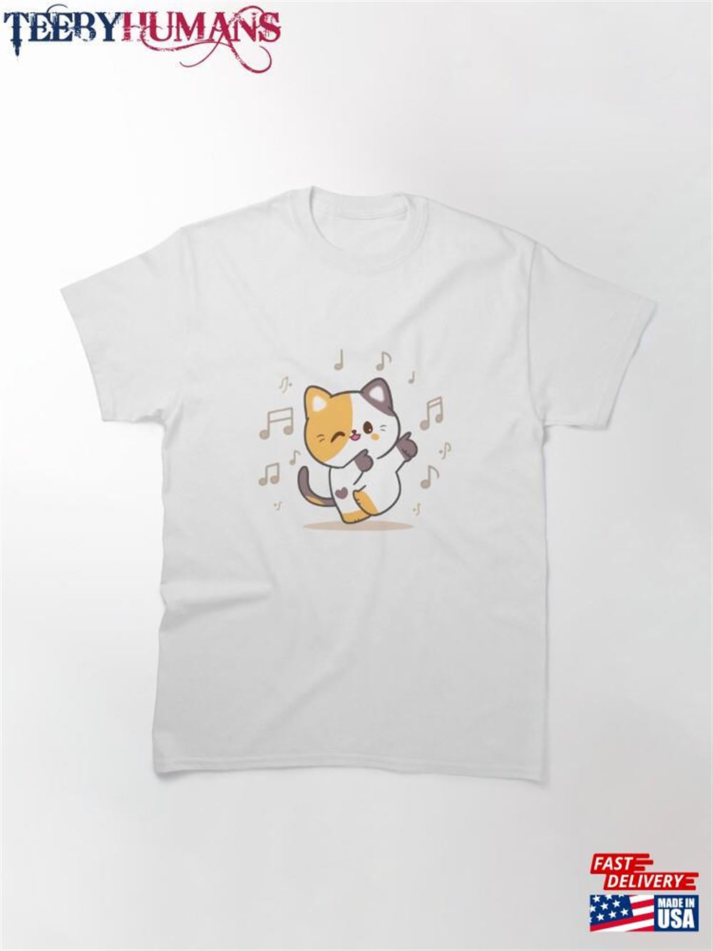 Dancing Cat Happy Kitten Positive Vibes Lovers T-Shirt Unisex Classic A music t-shirt is a type of clothing that features designs, logos, or images related to music. It is a popular fashion choice among music enthusiasts, musicians, and fans of specific bands or genres. These t-shirts often display the names or album covers of favorite bands or artists, iconic symbols associated with music, or lyrics from beloved songs. Music t-shirts serve as a form of self-expression, allowing individuals to showcase their musical preferences and interests. They can be found in various styles, colors, and sizes, catering to different tastes and fashion trends. Music t-shirts are not only a fashion statement but also a way for people to connect with others who share similar musical interests. Wearing a music t-shirt can spark conversations and create a sense of belonging within a community of music lovers. Whether it’s a vintage band t-shirt from the past or a contemporary design featuring current artists, music t-shirts are a fun and stylish way to celebrate the power and influence of music in our lives.