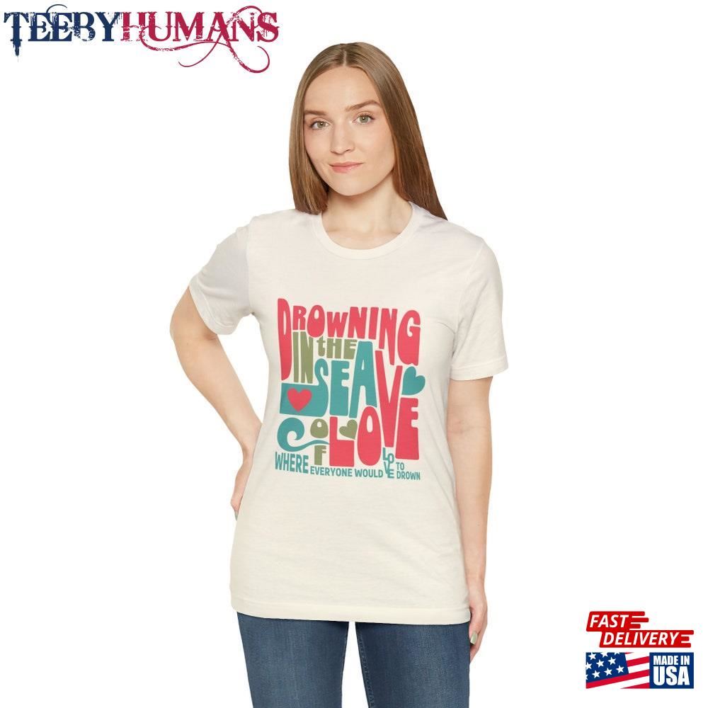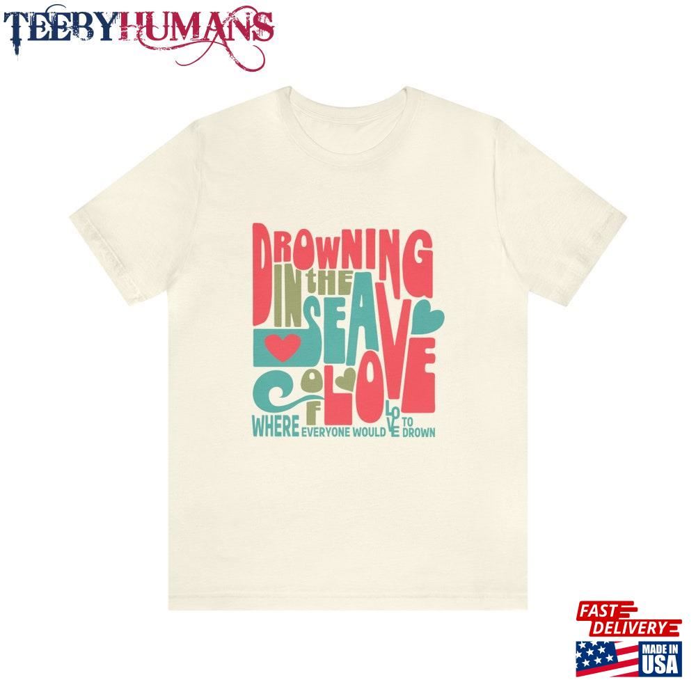 Drowning In The Sea Of Love Sara Classic Unisex A music t-shirt is a type of clothing that is designed to showcase one’s love and passion for music. It typically features various elements related to music, such as musical instruments, lyrics, album covers, or iconic images of famous musicians or bands. These t-shirts serve as a form of self-expression and allow individuals to display their musical taste and preferences to the world. Music t-shirts come in a wide range of styles, colors, and designs, catering to different genres and eras of music. They can be found in various sizes, from small to extra-large, ensuring that everyone can find a t-shirt that fits them comfortably. Some music t-shirts may also incorporate additional elements like tour dates, concert venues, or band logos, making them even more unique and collectible for fans. Wearing a music t-shirt not only shows one’s admiration for a particular artist or band but also serves as a conversation starter among fellow music enthusiasts. It can spark discussions about favorite songs, albums, or memorable concert experiences, creating a sense of camaraderie and shared passion for music. Music t-shirts are not only popular among fans but also embraced by musicians themselves. Many artists and bands create their own merchandise, including t-shirts, as a way to promote their music and connect with their audience. These t-shirts often become sought-after items for fans, representing a special connection to their favorite artists. In addition to being a fashion statement, music t-shirts can also be seen as a form of nostalgia. They can evoke memories of past concerts, music festivals, or significant moments in one’s life that were accompanied by a particular song or artist. By wearing a music t-shirt, individuals can relive those cherished memories and keep the spirit of music alive. Overall, a music t-shirt is more than just a piece of clothing. It is a symbol of one’s love for music, a means of self-expression, and a way to connect with others who share the same passion. Whether worn casually or at music events, these t-shirts serve as a reminder of the power and influence that music has on our lives.
