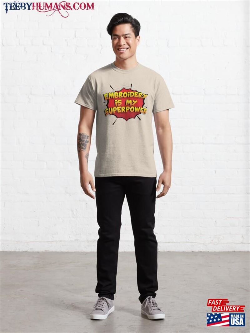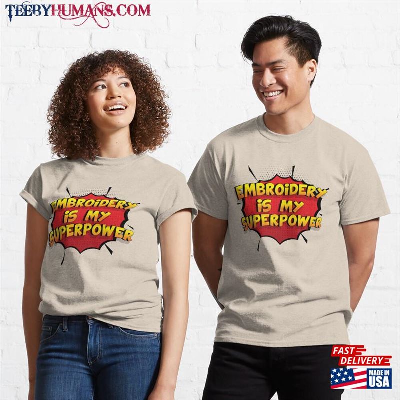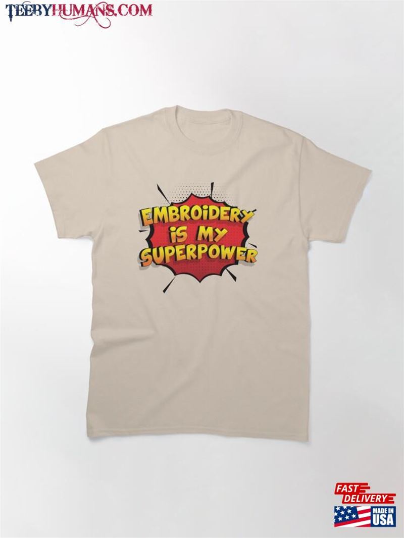 Embroidery Is My Superpower Funny Design Gift Classic T-Shirt Hoodie. T-shirts with embroidery are a stylish and trendy addition to any wardrobe. With intricate designs and beautiful stitching, these shirts can make a bold statement and elevate any outfit. Not only do they look great, but they also feel comfortable and soft on the skin.