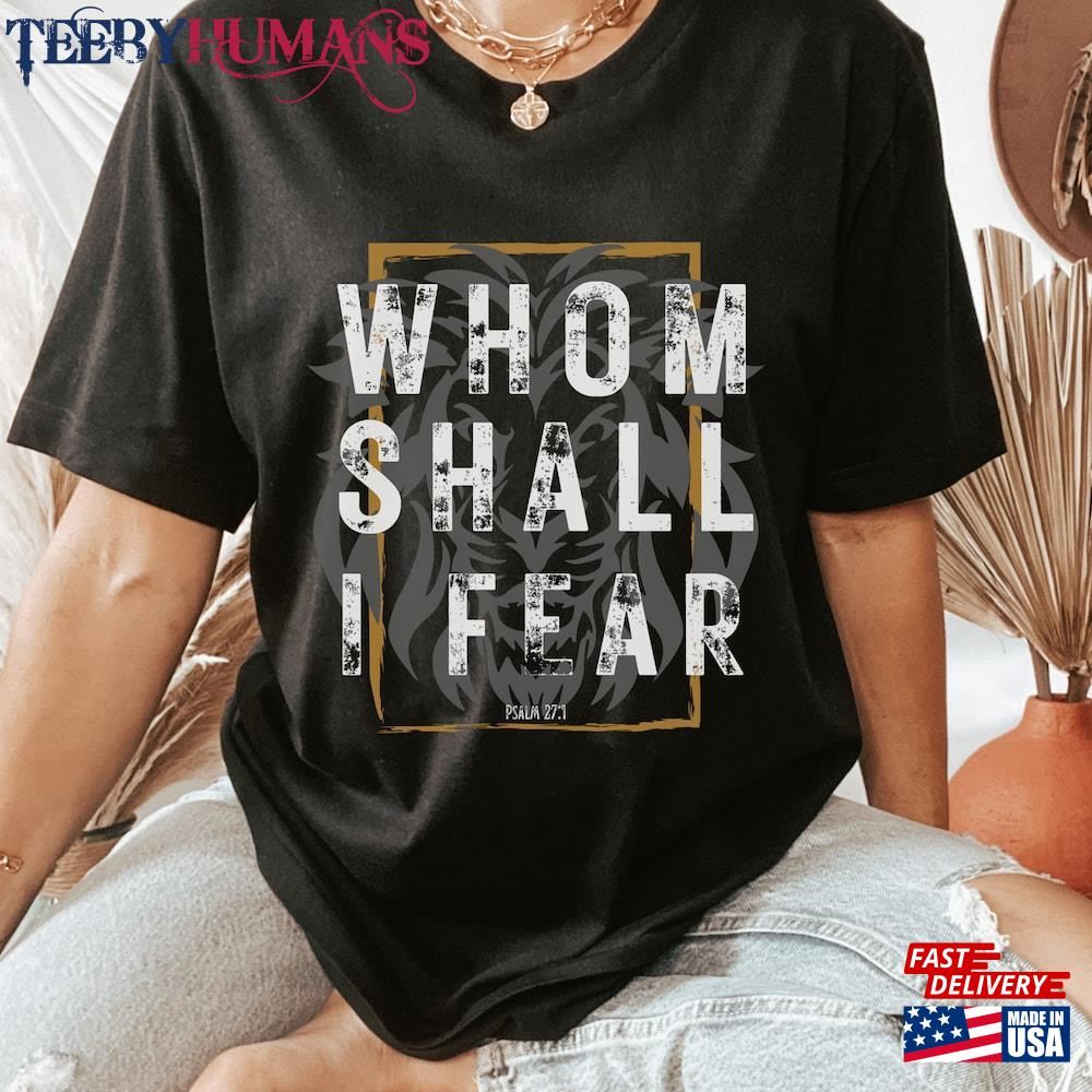 Whom Shall I Fear Psalm 27 1 Lion Unisex Jersey T T-Shirt A music t-shirt is a type of clothing that is designed to showcase one’s love and passion for music. It typically features various elements related to music, such as musical instruments, lyrics, album covers, or iconic images of famous musicians or bands. These t-shirts serve as a form of self-expression and allow individuals to display their musical taste and preferences to the world. Music t-shirts come in a wide range of styles, colors, and designs, catering to different genres and eras of music. They can be found in various sizes, from small to extra-large, ensuring that everyone can find a t-shirt that fits them comfortably. Some music t-shirts may also incorporate additional elements like tour dates, concert venues, or band logos, making them even more unique and collectible for fans. Wearing a music t-shirt not only shows one’s admiration for a particular artist or band but also serves as a conversation starter among fellow music enthusiasts. It can spark discussions about favorite songs, albums, or memorable concert experiences, creating a sense of camaraderie and shared passion for music. Music t-shirts are not only popular among fans but also embraced by musicians themselves. Many artists and bands create their own merchandise, including t-shirts, as a way to promote their music and connect with their audience. These t-shirts often become sought-after items for fans, representing a special connection to their favorite artists. In addition to being a fashion statement, music t-shirts can also be seen as a form of nostalgia. They can evoke memories of past concerts, music festivals, or significant moments in one’s life that were accompanied by a particular song or artist. By wearing a music t-shirt, individuals can relive those cherished memories and keep the spirit of music alive. Overall, a music t-shirt is more than just a piece of clothing. It is a symbol of one’s love for music, a means of self-expression, and a way to connect with others who share the same passion. Whether worn casually or at music events, these t-shirts serve as a reminder of the power and influence that music has on our lives.