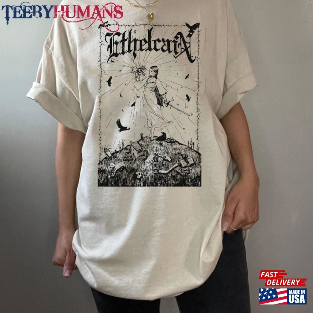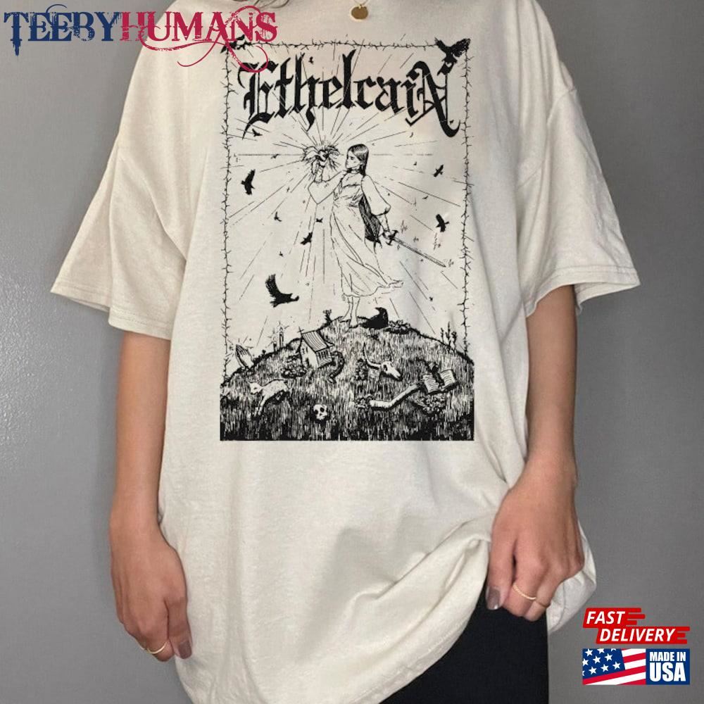 Ethel Cain Fan Shirt Merch Hoodie Sweatshirt Classic A music t-shirt is a type of clothing that is designed to showcase one’s love and passion for music. It typically features various elements related to music, such as musical instruments, lyrics, album covers, or iconic images of famous musicians or bands. These t-shirts serve as a form of self-expression and allow individuals to display their musical taste and preferences to the world. Music t-shirts come in a wide range of styles, colors, and designs, catering to different genres and eras of music. They can be found in various sizes, from small to extra-large, ensuring that everyone can find a t-shirt that fits them comfortably. Some music t-shirts may also incorporate additional elements like tour dates, concert venues, or band logos, making them even more unique and collectible for fans. Wearing a music t-shirt not only shows one’s admiration for a particular artist or band but also serves as a conversation starter among fellow music enthusiasts. It can spark discussions about favorite songs, albums, or memorable concert experiences, creating a sense of camaraderie and shared passion for music. Music t-shirts are not only popular among fans but also embraced by musicians themselves. Many artists and bands create their own merchandise, including t-shirts, as a way to promote their music and connect with their audience. These t-shirts often become sought-after items for fans, representing a special connection to their favorite artists. In addition to being a fashion statement, music t-shirts can also be seen as a form of nostalgia. They can evoke memories of past concerts, music festivals, or significant moments in one’s life that were accompanied by a particular song or artist. By wearing a music t-shirt, individuals can relive those cherished memories and keep the spirit of music alive. Overall, a music t-shirt is more than just a piece of clothing. It is a symbol of one’s love for music, a means of self-expression, and a way to connect with others who share the same passion. Whether worn casually or at music events, these t-shirts serve as a reminder of the power and influence that music has on our lives.