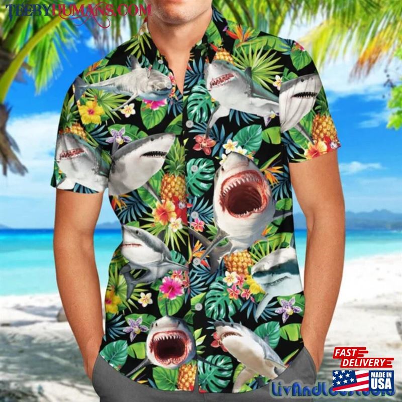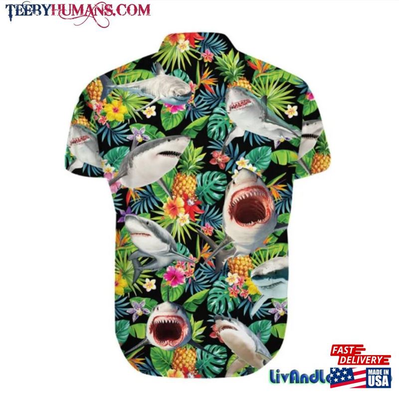 Funny Shark Pineapple Tropical Hawaiian Shirt Sharks Summer Aloha Hawaii Blue. The Hawaiian shirt has gained widespread popularity as a fashion staple, known for its colorful and vibrant floral prints. These shirts are lightweight, making them an ideal option for warmer weather.