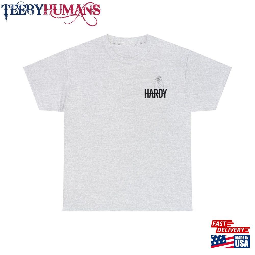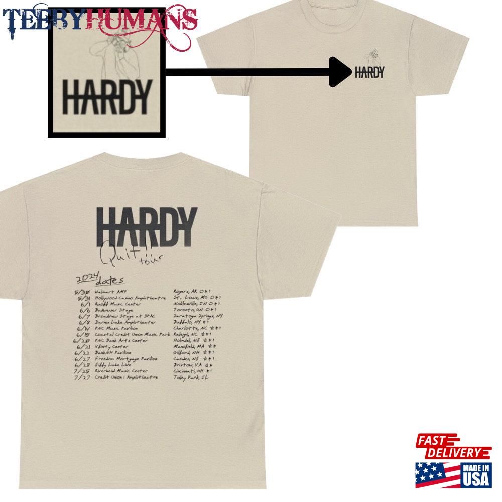Hardy Quit Tour 2024 T-Shirt Unisex Sweatshirt A music t-shirt is a type of clothing that is designed to showcase one’s love and passion for music. It typically features various elements related to music, such as musical instruments, lyrics, album covers, or iconic images of famous musicians or bands. These t-shirts serve as a form of self-expression and allow individuals to display their musical taste and preferences to the world. Music t-shirts come in a wide range of styles, colors, and designs, catering to different genres and eras of music. They can be found in various sizes, from small to extra-large, ensuring that everyone can find a t-shirt that fits them comfortably. Some music t-shirts may also incorporate additional elements like tour dates, concert venues, or band logos, making them even more unique and collectible for fans. Wearing a music t-shirt not only shows one’s admiration for a particular artist or band but also serves as a conversation starter among fellow music enthusiasts. It can spark discussions about favorite songs, albums, or memorable concert experiences, creating a sense of camaraderie and shared passion for music. Music t-shirts are not only popular among fans but also embraced by musicians themselves. Many artists and bands create their own merchandise, including t-shirts, as a way to promote their music and connect with their audience. These t-shirts often become sought-after items for fans, representing a special connection to their favorite artists. In addition to being a fashion statement, music t-shirts can also be seen as a form of nostalgia. They can evoke memories of past concerts, music festivals, or significant moments in one’s life that were accompanied by a particular song or artist. By wearing a music t-shirt, individuals can relive those cherished memories and keep the spirit of music alive. Overall, a music t-shirt is more than just a piece of clothing. It is a symbol of one’s love for music, a means of self-expression, and a way to connect with others who share the same passion. Whether worn casually or at music events, these t-shirts serve as a reminder of the power and influence that music has on our lives.