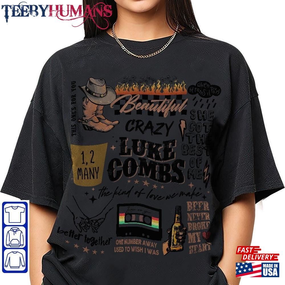 Luke Combs Crazy Bullhead Sweatshirt Country Music T-Shirt Hoodie Classic A music t-shirt is a type of clothing that features designs, logos, or images related to music. It is a popular fashion choice among music enthusiasts, musicians, and fans of specific bands or genres. These t-shirts often display the names or album covers of favorite bands or artists, iconic symbols associated with music, or lyrics from beloved songs. Music t-shirts serve as a form of self-expression, allowing individuals to showcase their musical preferences and interests. They can be found in various styles, colors, and sizes, catering to different tastes and fashion trends. Music t-shirts are not only a fashion statement but also a way for people to connect with others who share similar musical interests. Wearing a music t-shirt can spark conversations and create a sense of belonging within a community of music lovers. Whether it’s a vintage band t-shirt from the past or a contemporary design featuring current artists, music t-shirts are a fun and stylish way to celebrate the power and influence of music in our lives.