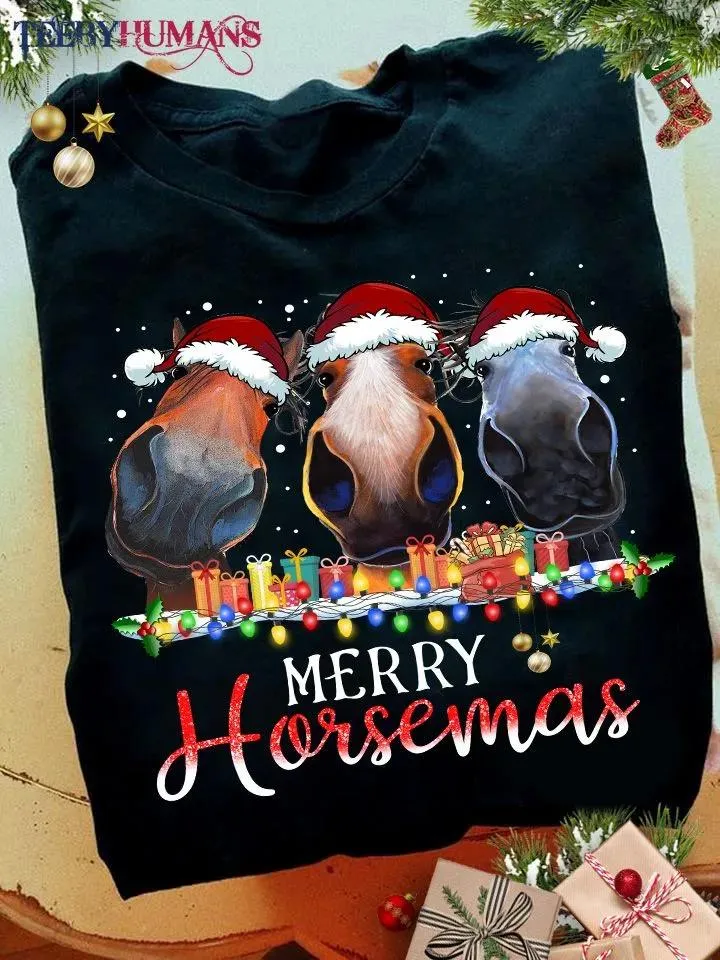 Merry Horsemas Unisex Sweatshirt Hoodie Classic T-Shirt. Christmas is an annual festival commemorating the birth of Jesus Christ, observed primarily on December 25 as a religious and cultural celebration among billions of people around the world. A feast central to the Christian liturgical year, it is preceded by the season of Advent or the Nativity Fast and initiates the season of Christmastide, which historically in the West lasts twelve days and culminates on Twelfth Night. Christmas Day is a public holiday in many countries, is celebrated religiously by a majority of Christians, as well as culturally by many non-Christians, and forms an integral part of the holiday season organized around it.