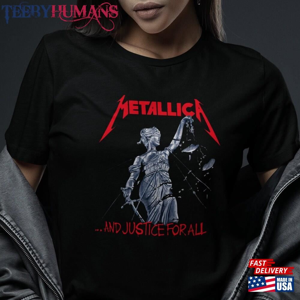 Metallica And Justice For All T-Shirt Classic A music t-shirt is a type of clothing that is designed to showcase one’s love and passion for music. It typically features various elements related to music, such as musical instruments, lyrics, album covers, or iconic images of famous musicians or bands. These t-shirts serve as a form of self-expression and allow individuals to display their musical taste and preferences to the world. Music t-shirts come in a wide range of styles, colors, and designs, catering to different genres and eras of music. They can be found in various sizes, from small to extra-large, ensuring that everyone can find a t-shirt that fits them comfortably. Some music t-shirts may also incorporate additional elements like tour dates, concert venues, or band logos, making them even more unique and collectible for fans. Wearing a music t-shirt not only shows one’s admiration for a particular artist or band but also serves as a conversation starter among fellow music enthusiasts. It can spark discussions about favorite songs, albums, or memorable concert experiences, creating a sense of camaraderie and shared passion for music. Music t-shirts are not only popular among fans but also embraced by musicians themselves. Many artists and bands create their own merchandise, including t-shirts, as a way to promote their music and connect with their audience. These t-shirts often become sought-after items for fans, representing a special connection to their favorite artists. In addition to being a fashion statement, music t-shirts can also be seen as a form of nostalgia. They can evoke memories of past concerts, music festivals, or significant moments in one’s life that were accompanied by a particular song or artist. By wearing a music t-shirt, individuals can relive those cherished memories and keep the spirit of music alive. Overall, a music t-shirt is more than just a piece of clothing. It is a symbol of one’s love for music, a means of self-expression, and a way to connect with others who share the same passion. Whether worn casually or at music events, these t-shirts serve as a reminder of the power and influence that music has on our lives.
