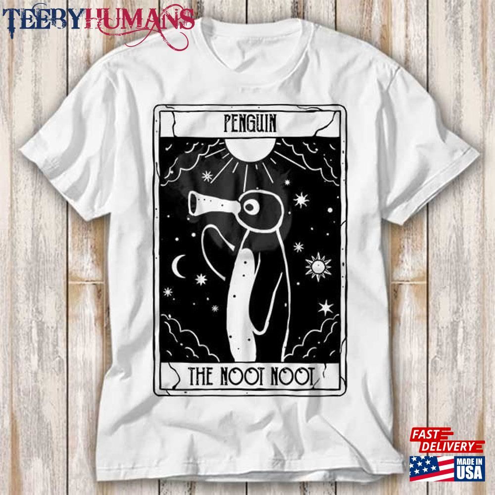 Noot Funny Tarot Card Penguin Rainbow Pingu Distressed T-Shirt Sweatshirt Hoodie A music t-shirt is a type of clothing that features designs, logos, or images related to music. It is a popular fashion choice among music enthusiasts, musicians, and fans of specific bands or genres. These t-shirts often display the names or album covers of favorite bands or artists, iconic symbols associated with music, or lyrics from beloved songs. Music t-shirts serve as a form of self-expression, allowing individuals to showcase their musical preferences and interests. They can be found in various styles, colors, and sizes, catering to different tastes and fashion trends. Music t-shirts are not only a fashion statement but also a way for people to connect with others who share similar musical interests. Wearing a music t-shirt can spark conversations and create a sense of belonging within a community of music lovers. Whether it’s a vintage band t-shirt from the past or a contemporary design featuring current artists, music t-shirts are a fun and stylish way to celebrate the power and influence of music in our lives.