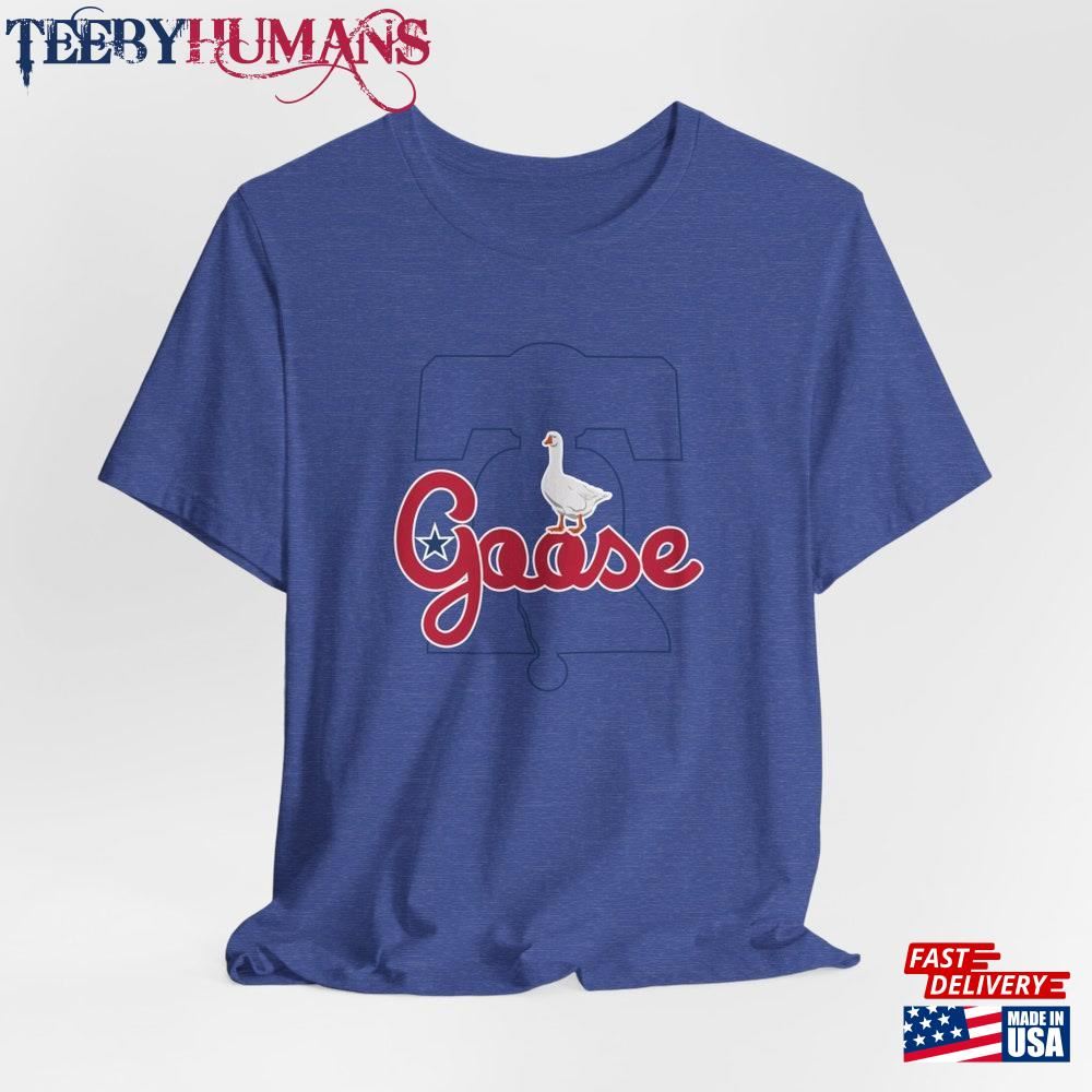 Phillies And Goose Band Inspired T-Shirt Unisex A music t-shirt is a type of clothing that is designed to showcase one’s love and passion for music. It typically features various elements related to music, such as musical instruments, lyrics, album covers, or iconic images of famous musicians or bands. These t-shirts serve as a form of self-expression and allow individuals to display their musical taste and preferences to the world. Music t-shirts come in a wide range of styles, colors, and designs, catering to different genres and eras of music. They can be found in various sizes, from small to extra-large, ensuring that everyone can find a t-shirt that fits them comfortably. Some music t-shirts may also incorporate additional elements like tour dates, concert venues, or band logos, making them even more unique and collectible for fans. Wearing a music t-shirt not only shows one’s admiration for a particular artist or band but also serves as a conversation starter among fellow music enthusiasts. It can spark discussions about favorite songs, albums, or memorable concert experiences, creating a sense of camaraderie and shared passion for music. Music t-shirts are not only popular among fans but also embraced by musicians themselves. Many artists and bands create their own merchandise, including t-shirts, as a way to promote their music and connect with their audience. These t-shirts often become sought-after items for fans, representing a special connection to their favorite artists. In addition to being a fashion statement, music t-shirts can also be seen as a form of nostalgia. They can evoke memories of past concerts, music festivals, or significant moments in one’s life that were accompanied by a particular song or artist. By wearing a music t-shirt, individuals can relive those cherished memories and keep the spirit of music alive. Overall, a music t-shirt is more than just a piece of clothing. It is a symbol of one’s love for music, a means of self-expression, and a way to connect with others who share the same passion. Whether worn casually or at music events, these t-shirts serve as a reminder of the power and influence that music has on our lives.