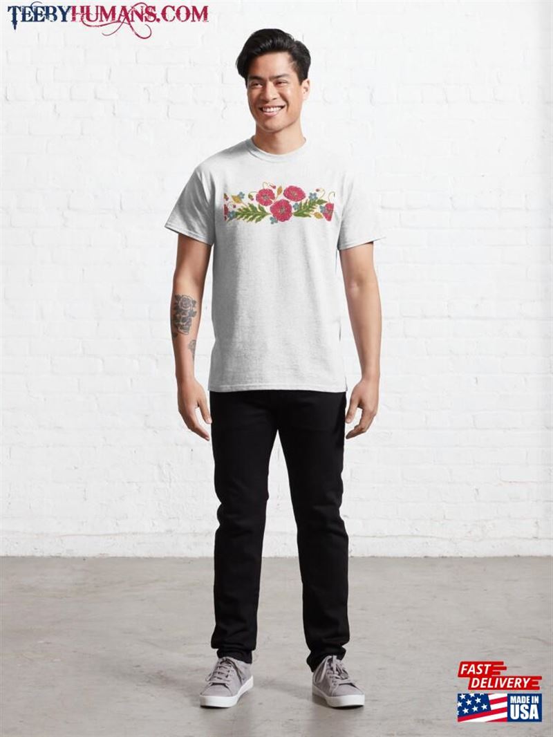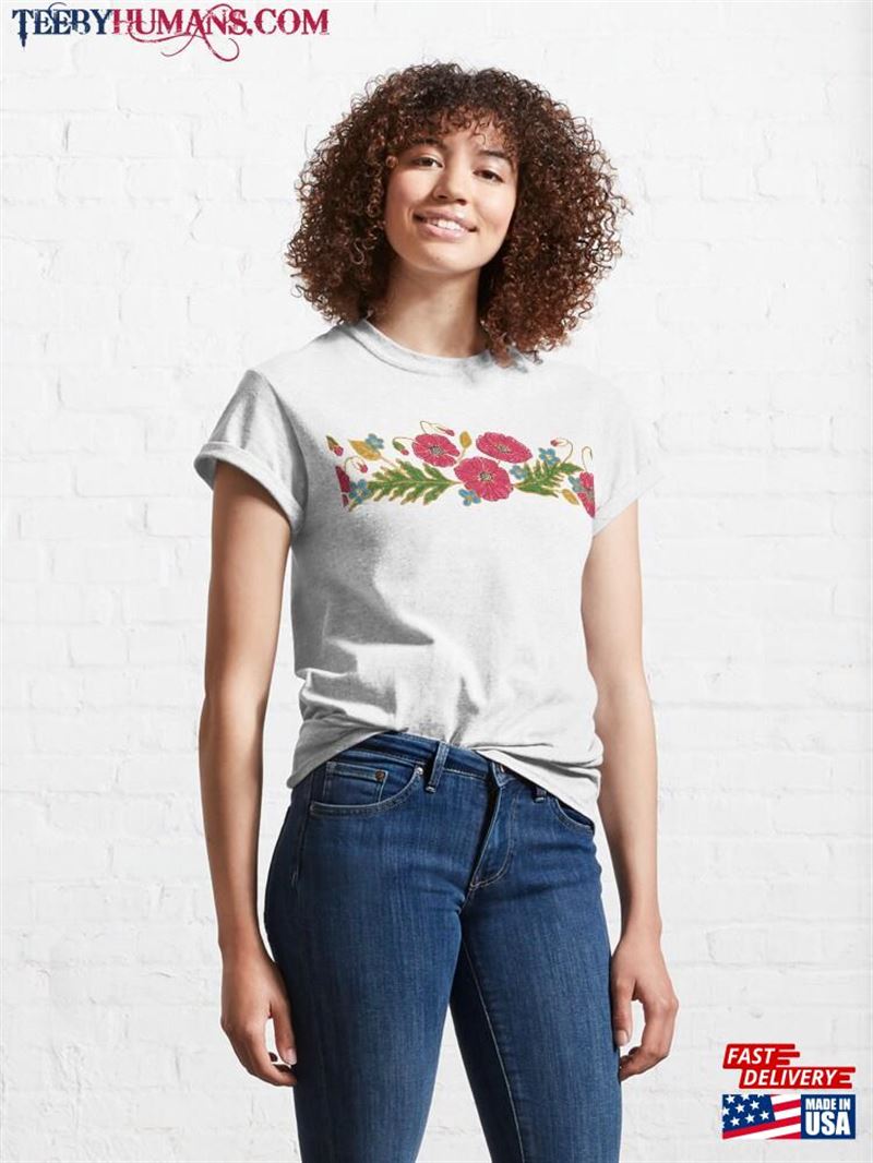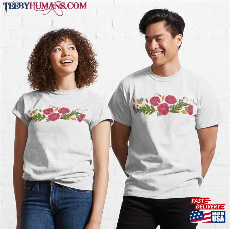 The Red Poppy Ukrainian Flower Classic T-Shirt Hoodie. T-shirts with embroidery are a stylish and trendy addition to any wardrobe. With intricate designs and beautiful stitching, these shirts can make a bold statement and elevate any outfit. Not only do they look great, but they also feel comfortable and soft on the skin.