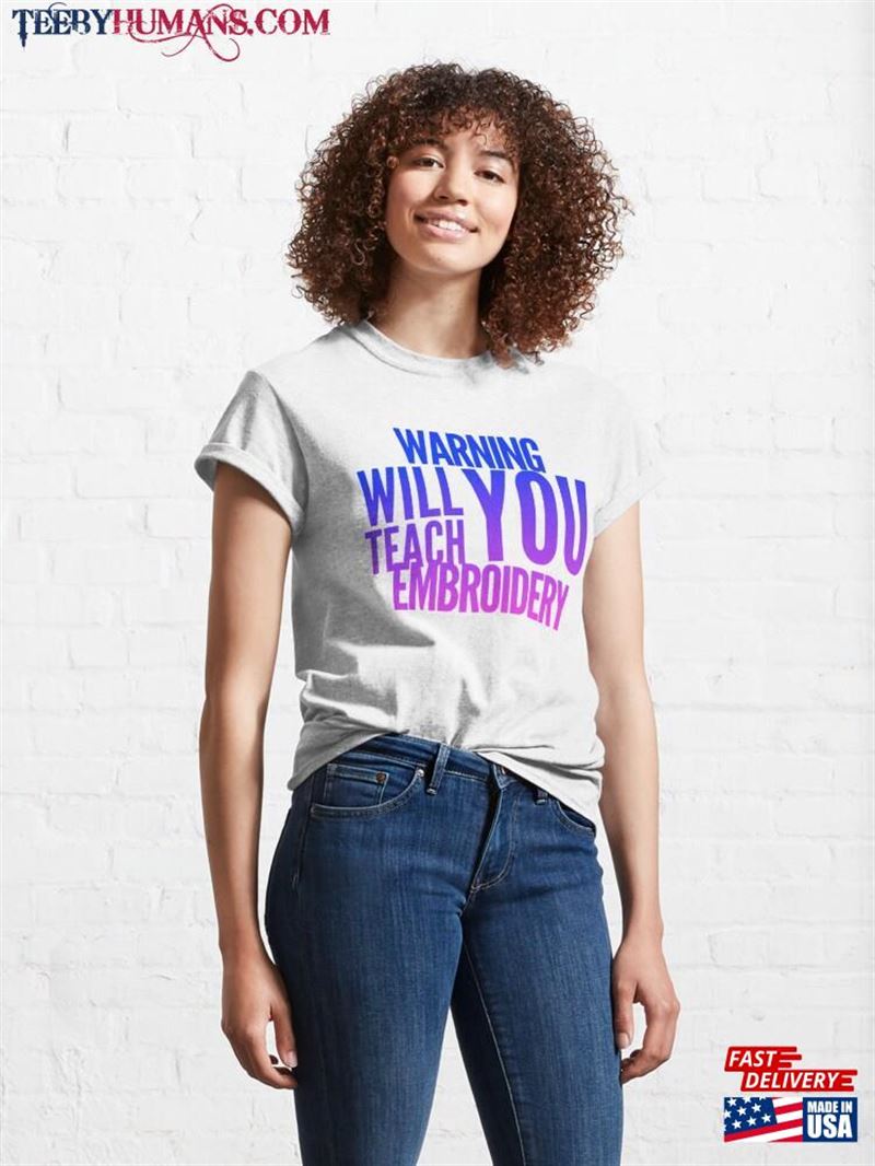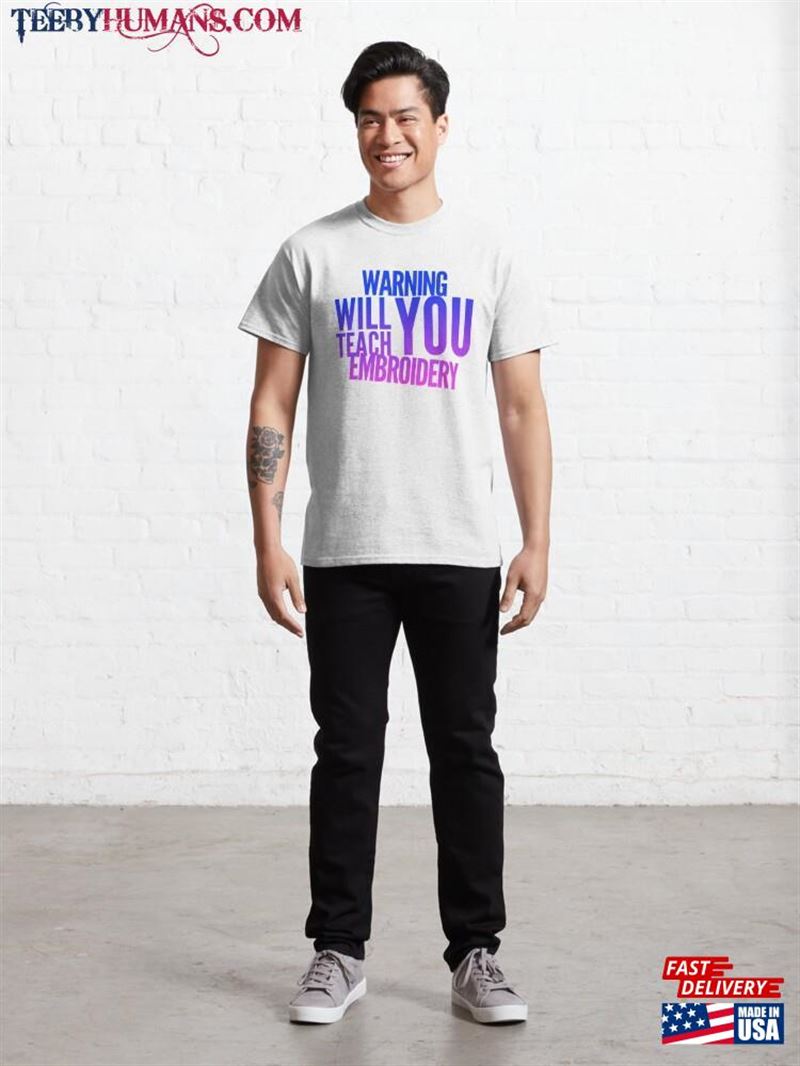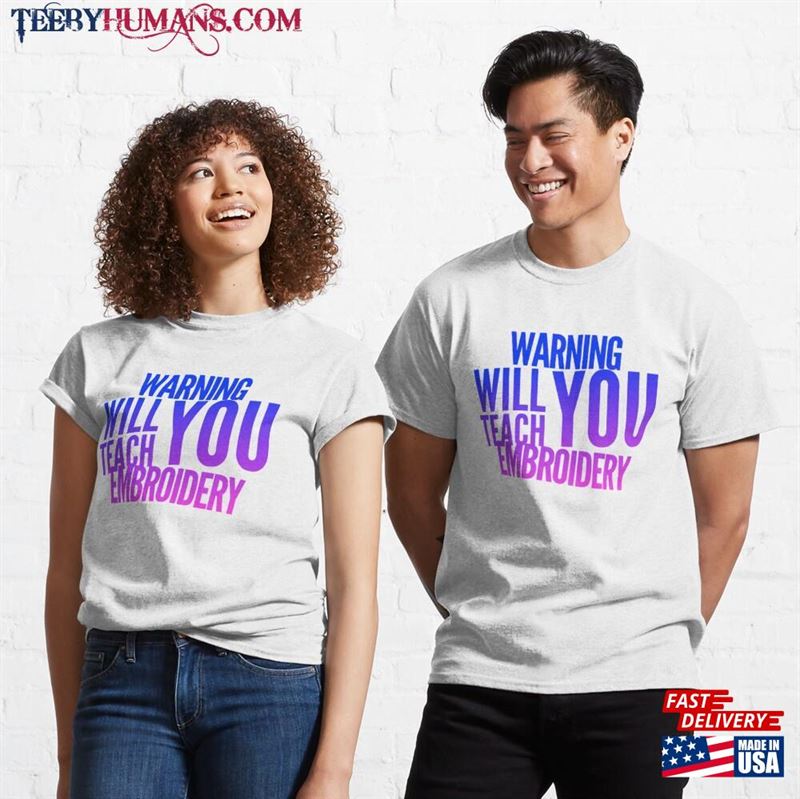 Warning Will Teach You Embroidery Classic T-Shirt Unisex. T-shirts with embroidery are a stylish and trendy addition to any wardrobe. With intricate designs and beautiful stitching, these shirts can make a bold statement and elevate any outfit. Not only do they look great, but they also feel comfortable and soft on the skin.