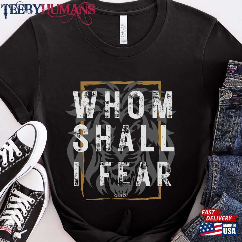 Whom Shall I Fear Psalm 27 1 Lion Unisex Jersey T T-Shirt A music t-shirt is a type of clothing that is designed to showcase one’s love and passion for music. It typically features various elements related to music, such as musical instruments, lyrics, album covers, or iconic images of famous musicians or bands. These t-shirts serve as a form of self-expression and allow individuals to display their musical taste and preferences to the world. Music t-shirts come in a wide range of styles, colors, and designs, catering to different genres and eras of music. They can be found in various sizes, from small to extra-large, ensuring that everyone can find a t-shirt that fits them comfortably. Some music t-shirts may also incorporate additional elements like tour dates, concert venues, or band logos, making them even more unique and collectible for fans. Wearing a music t-shirt not only shows one’s admiration for a particular artist or band but also serves as a conversation starter among fellow music enthusiasts. It can spark discussions about favorite songs, albums, or memorable concert experiences, creating a sense of camaraderie and shared passion for music. Music t-shirts are not only popular among fans but also embraced by musicians themselves. Many artists and bands create their own merchandise, including t-shirts, as a way to promote their music and connect with their audience. These t-shirts often become sought-after items for fans, representing a special connection to their favorite artists. In addition to being a fashion statement, music t-shirts can also be seen as a form of nostalgia. They can evoke memories of past concerts, music festivals, or significant moments in one’s life that were accompanied by a particular song or artist. By wearing a music t-shirt, individuals can relive those cherished memories and keep the spirit of music alive. Overall, a music t-shirt is more than just a piece of clothing. It is a symbol of one’s love for music, a means of self-expression, and a way to connect with others who share the same passion. Whether worn casually or at music events, these t-shirts serve as a reminder of the power and influence that music has on our lives.